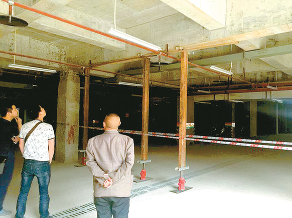 记者注意到,出现裂缝的承重横梁用3根与承重柱等高的千斤顶支撑着。不远处另一条承重横梁也出现几道裂痕。