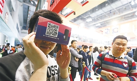 昨日,在万科展台,工作人员便把VR眼镜(虚拟现实头戴显示器设备,即VR头显)带到现场,市民只要扫一扫二维码,就可以选择自己想要了解的楼盘,再带上VR眼镜,便可360度看到该楼盘的样板房,和自己走进样板房一样。“这样不仅节约成本,消费者体验也更好。”工作人员介绍。
